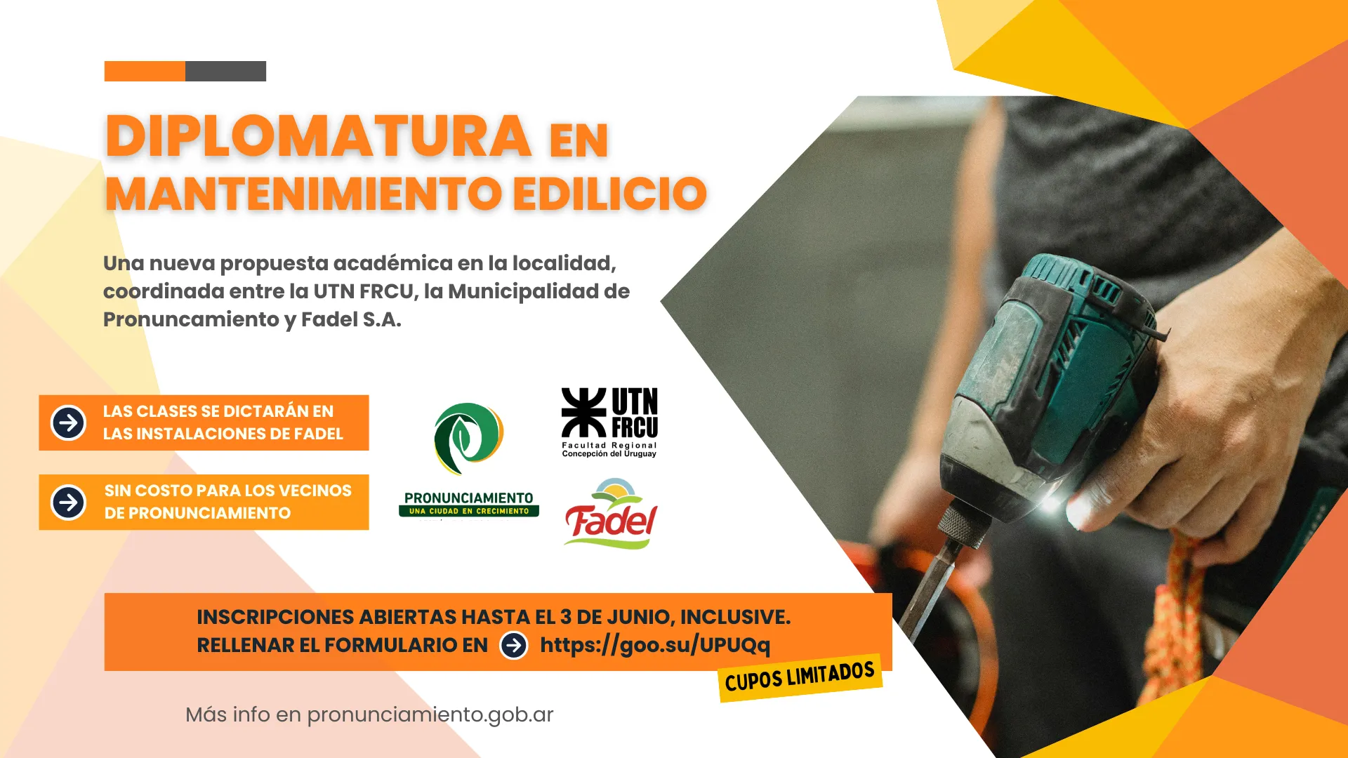 La Municipalidad de Pronunciamiento, por intermedio del área del Parque Industrial, ha trabajado con la Facultad Regional de Concepción del Uruguay (FRCU) de la Universidad Tecnológica Nacional (UTN) y la empresa Fadel S.A. para traer la Diplomatura Universitaria en Mantenimiento de Instalaciones Edilicias a la localidad. Con cupos limitados, las inscripciones se abren ahora mismo para que puedan cursar los vecinos de Pronunciamiento de manera gratuita.